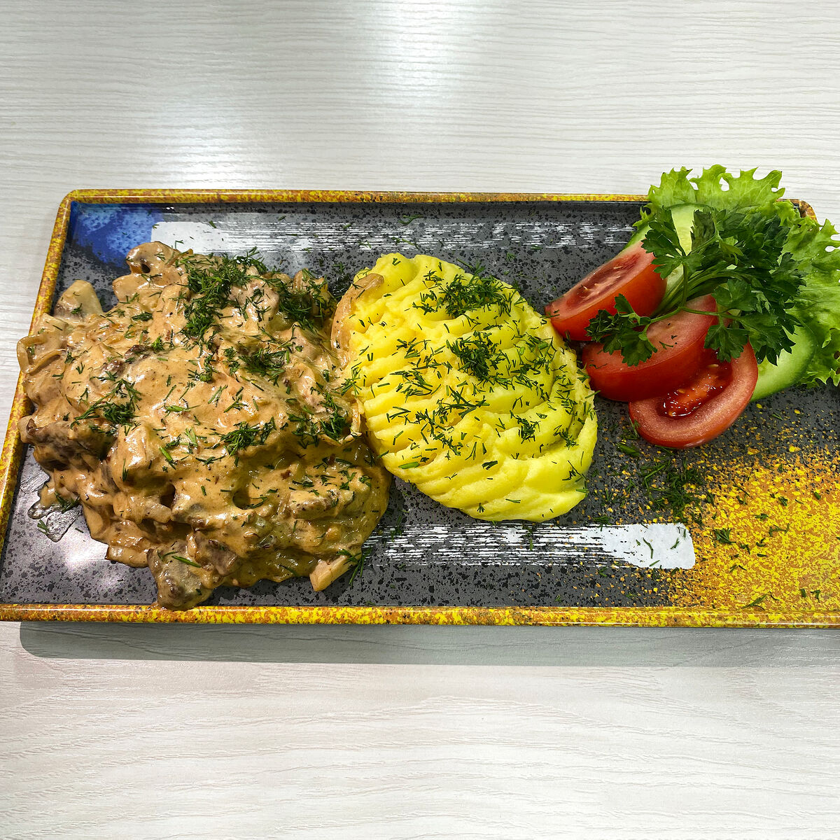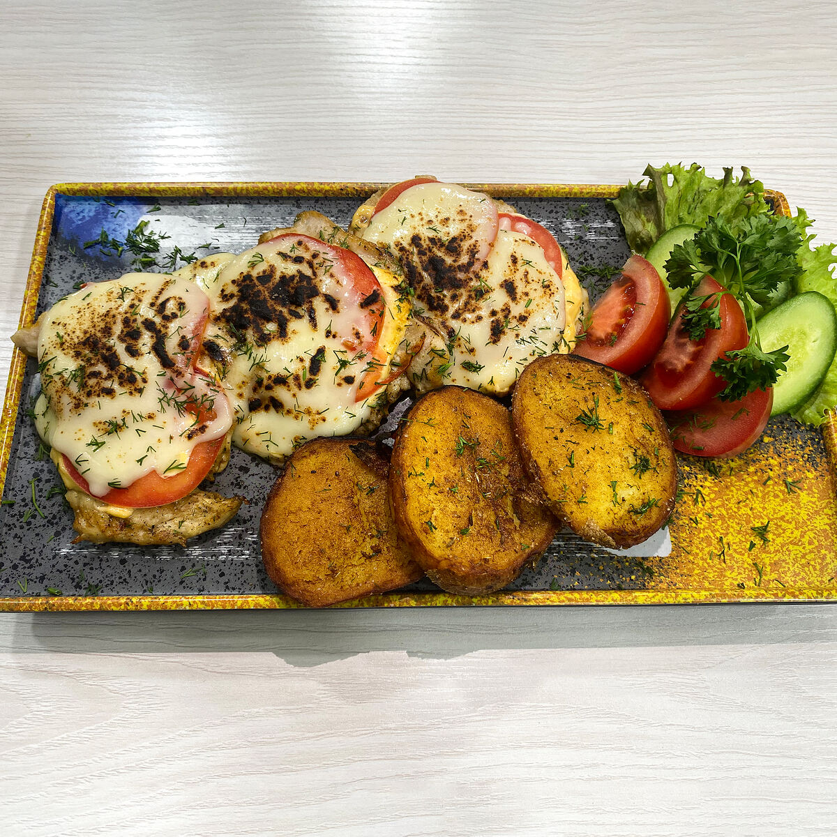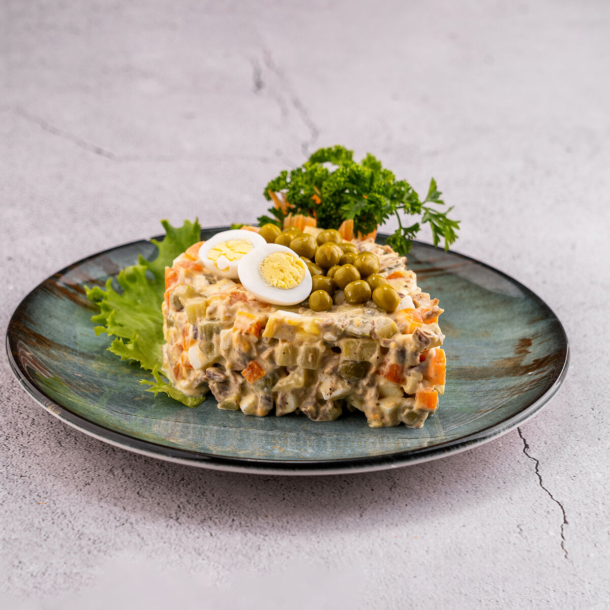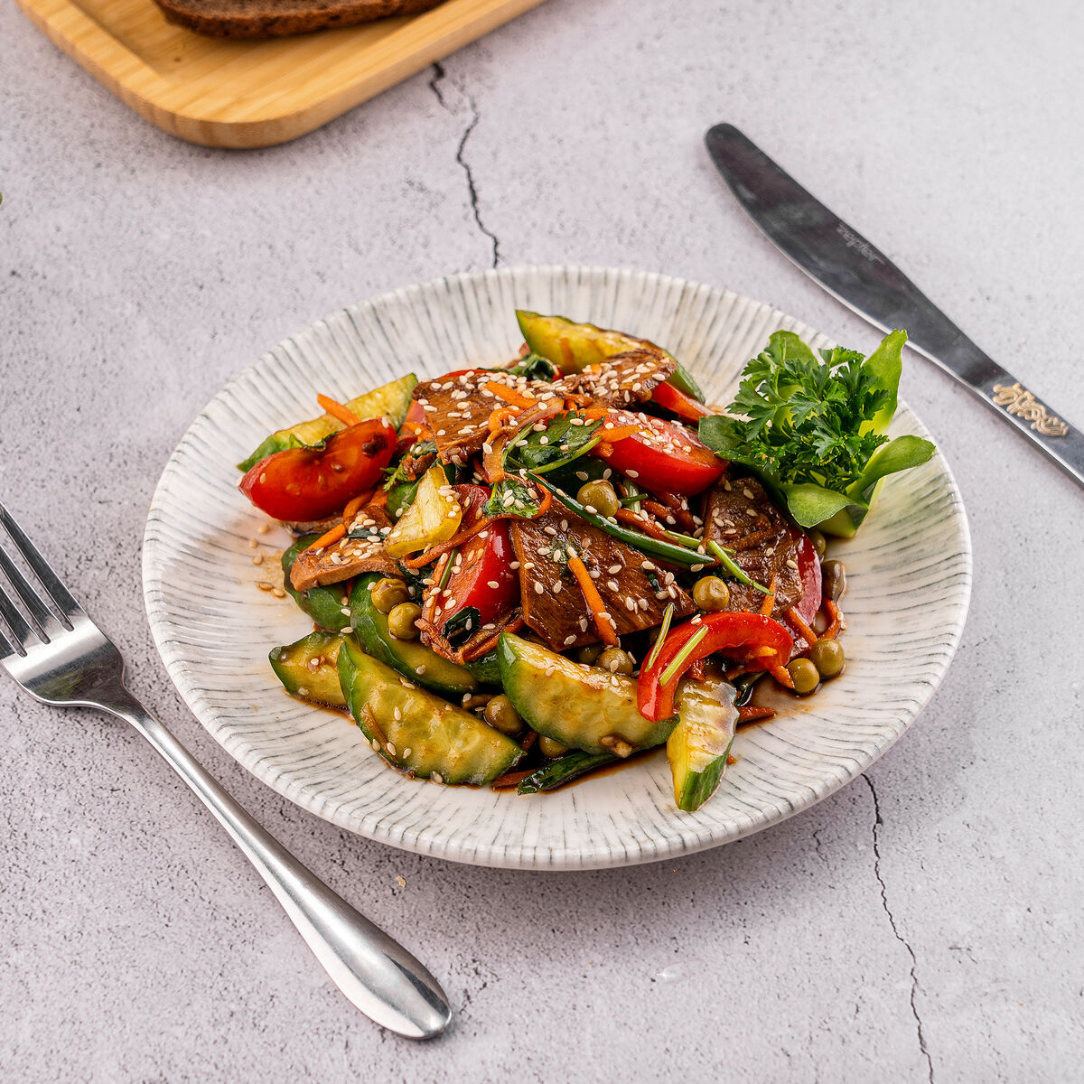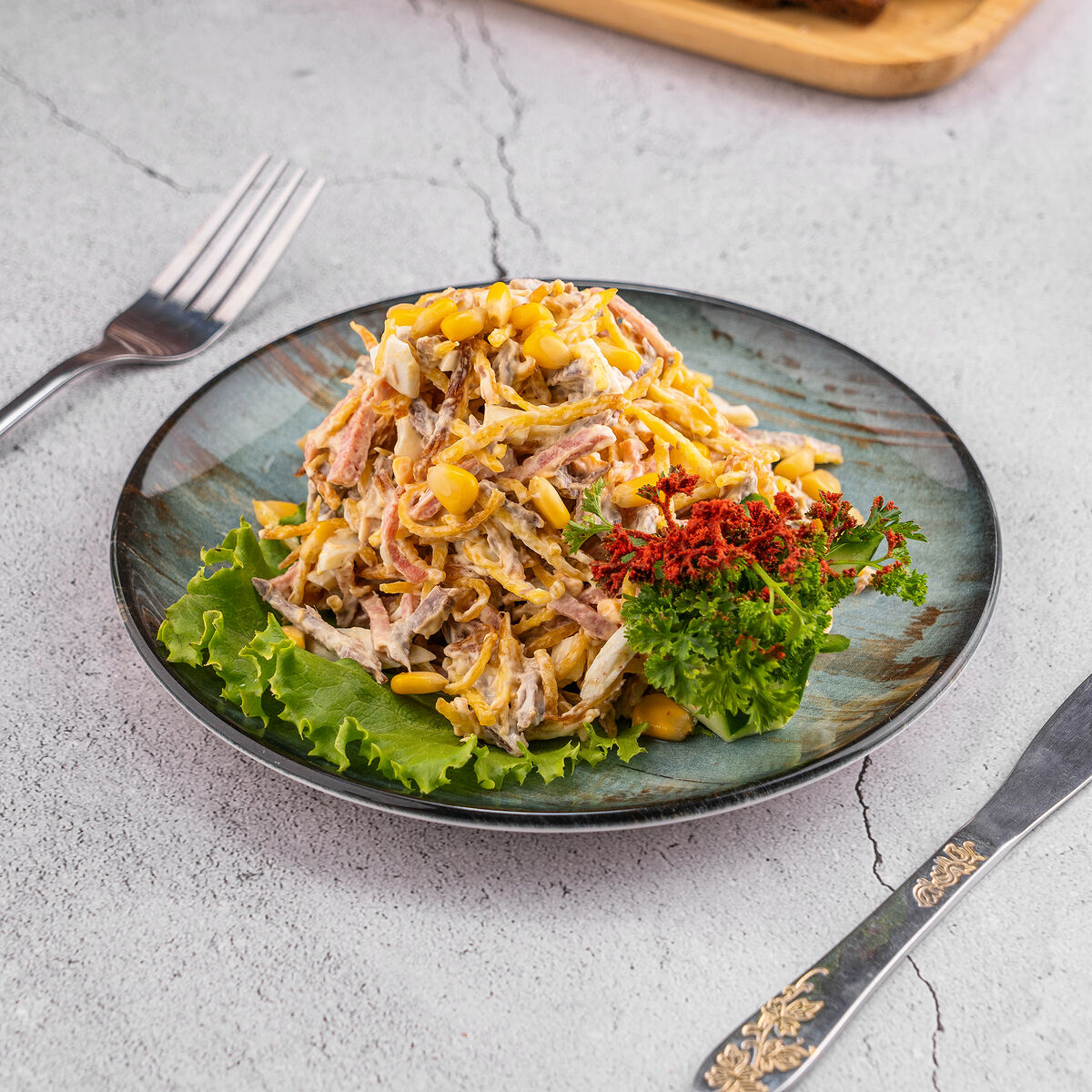 Состав: Огурцы, помидор, грибы маринованные, кукуруза, салат айсберг, куриная грудка, майонез