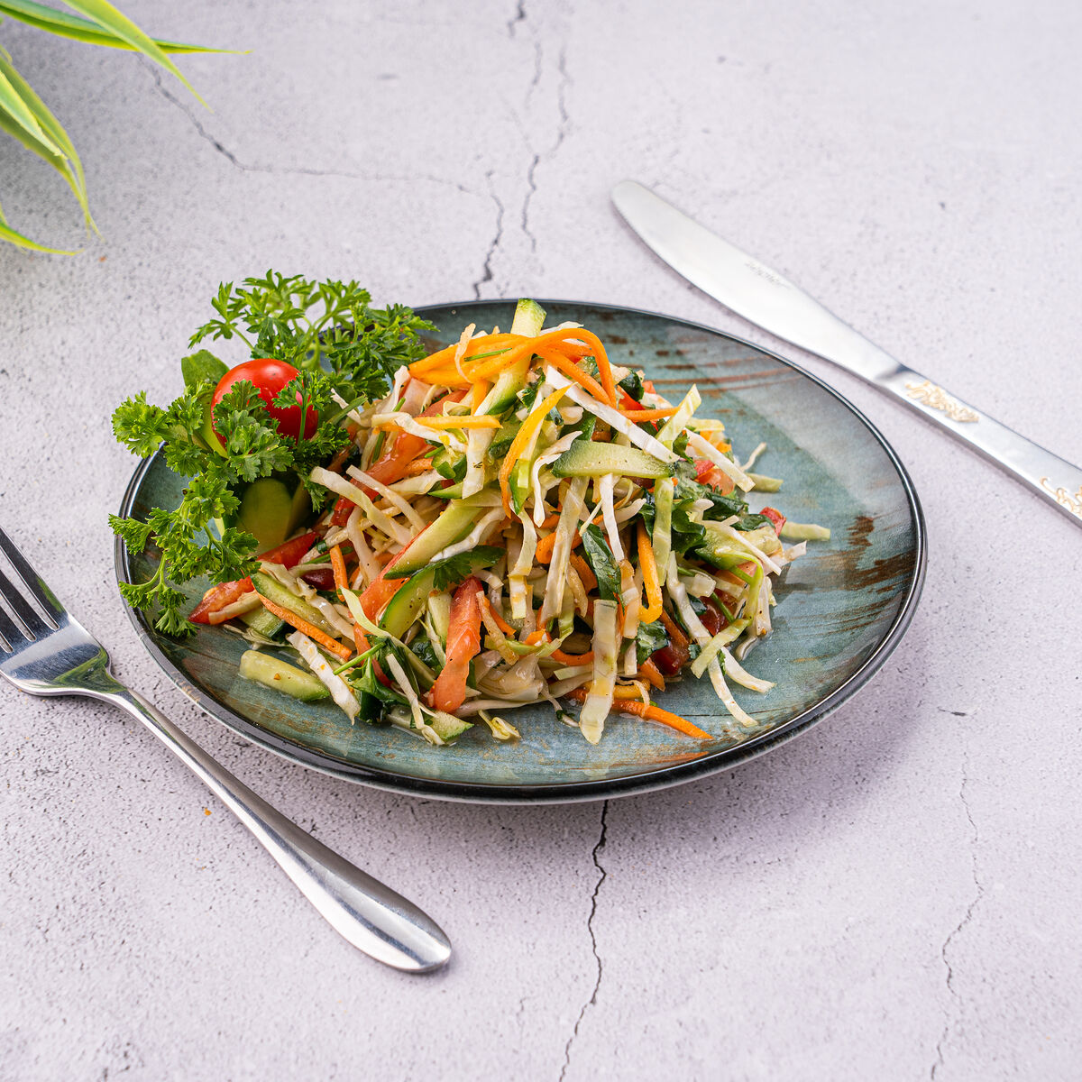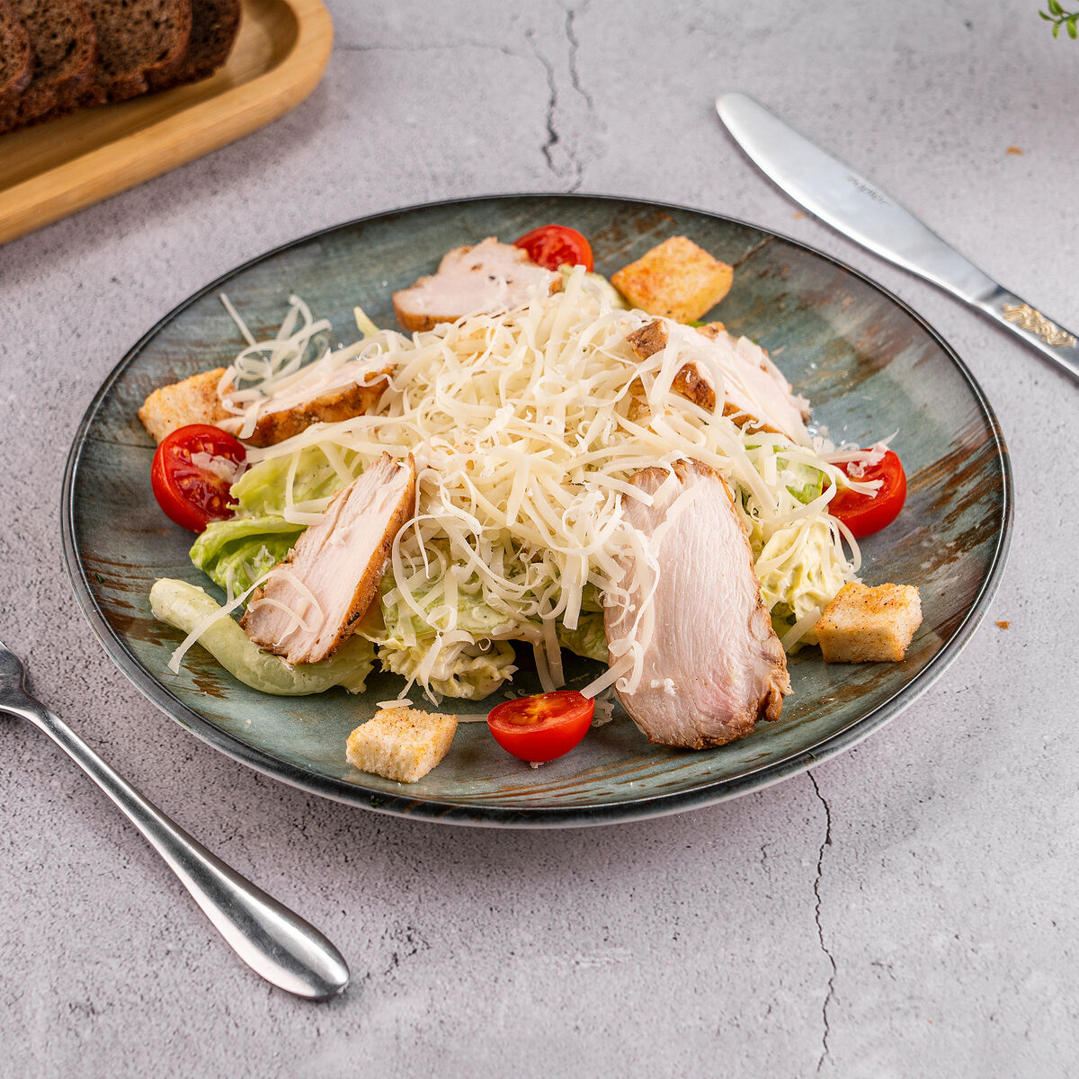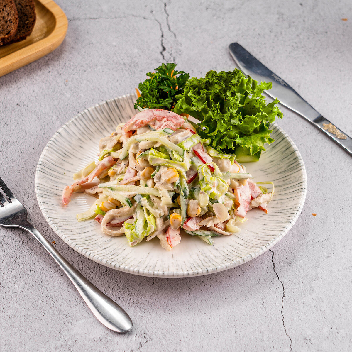 Состав: Огурцы, помидор, грибы маринованные, кукуруза, салат айсберг, куриная грудка, майонез