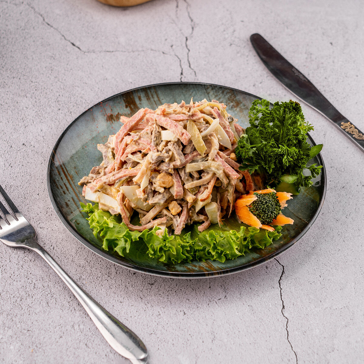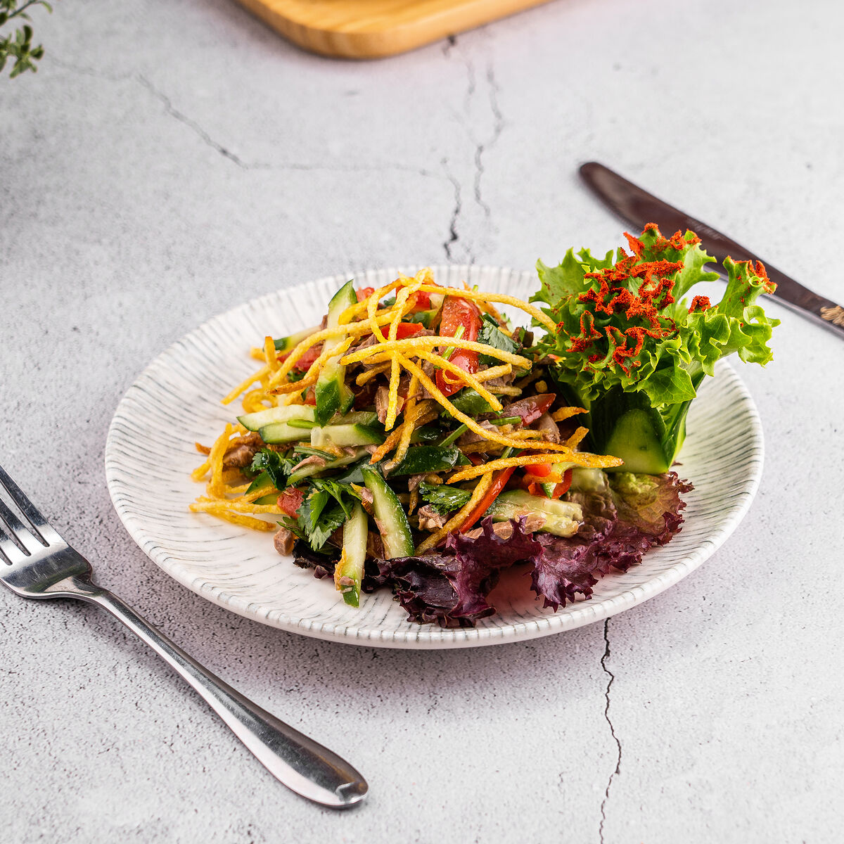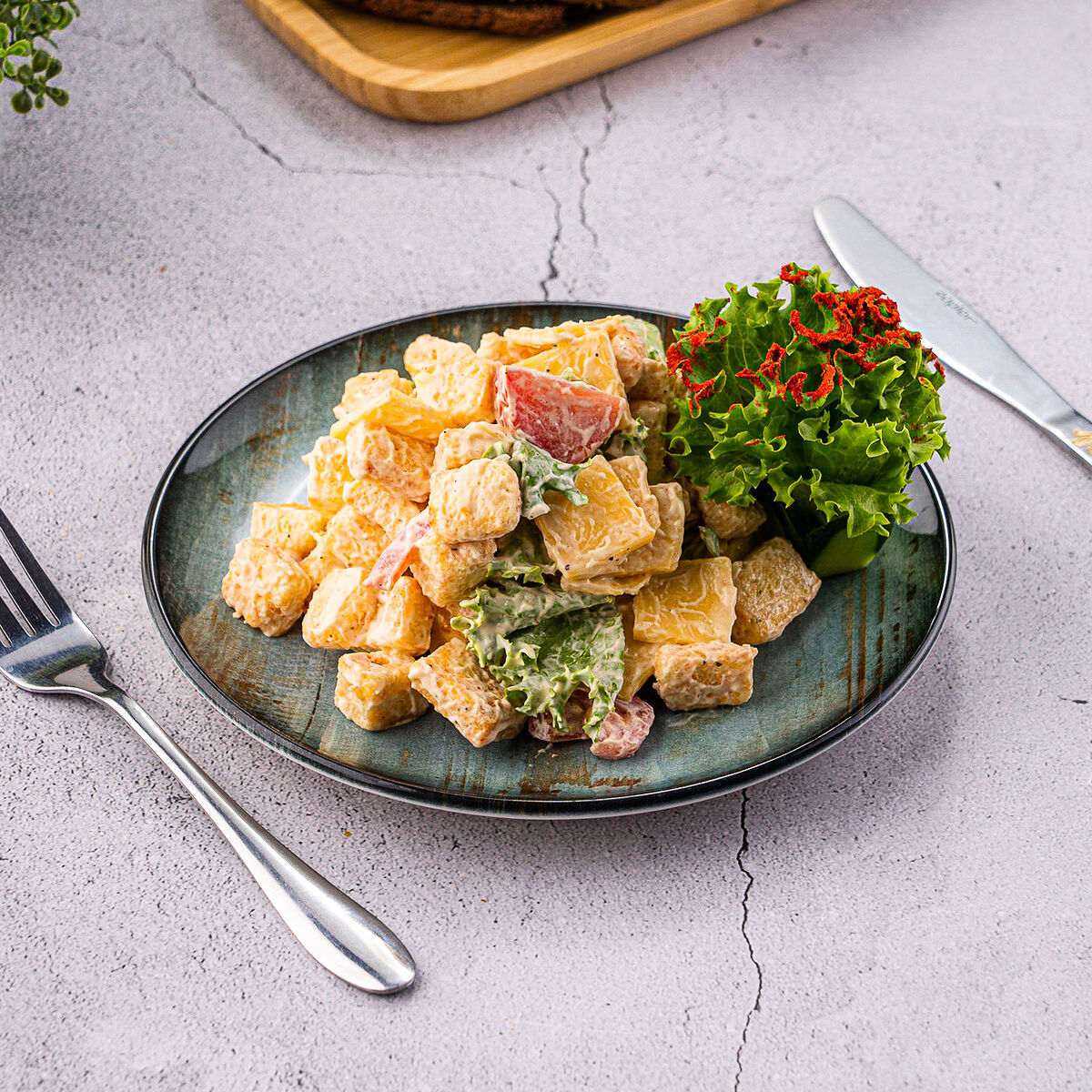 Состав: Огурцы, помидор, грибы маринованные, кукуруза, салат айсберг, куриная грудка, майонез